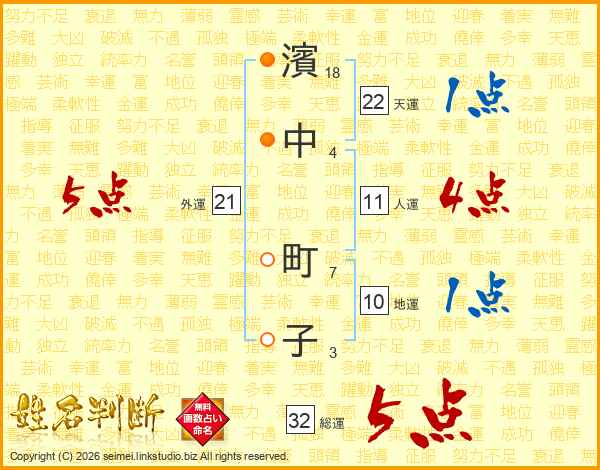 生活面を象徴する運勢です。外部から受ける影響力を表し、結婚運、家庭運や職場、環境への順応性を表します。総運から人運を引いた画数。姓や名が1文字の場合を除く。