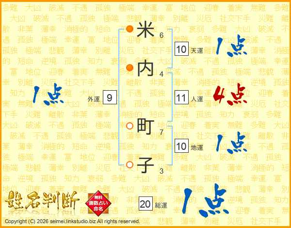生活面を象徴する運勢です。外部から受ける影響力を表し、結婚運、家庭運や職場、環境への順応性を表します。総運から人運を引いた画数。姓や名が1文字の場合を除く。