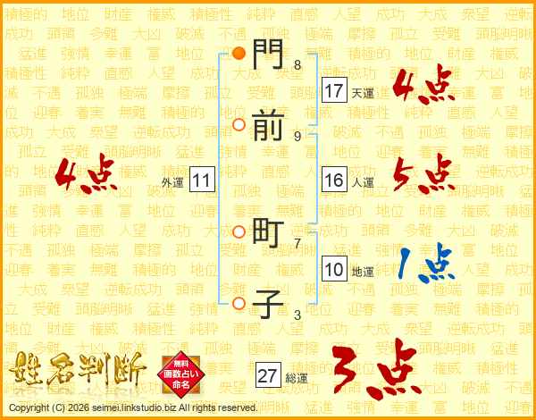 生活面を象徴する運勢です。外部から受ける影響力を表し、結婚運、家庭運や職場、環境への順応性を表します。総運から人運を引いた画数。姓や名が1文字の場合を除く。