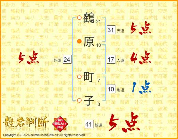 生活面を象徴する運勢です。外部から受ける影響力を表し、結婚運、家庭運や職場、環境への順応性を表します。総運から人運を引いた画数。姓や名が1文字の場合を除く。