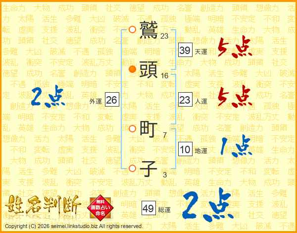 鷲(23画)頭(16画) 町(7画)子(3画)