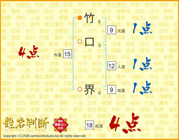 生活面を象徴する運勢です。外部から受ける影響力を表し、結婚運、家庭運や職場、環境への順応性を表します。総運から人運を引いた画数。姓や名が1文字の場合を除く。