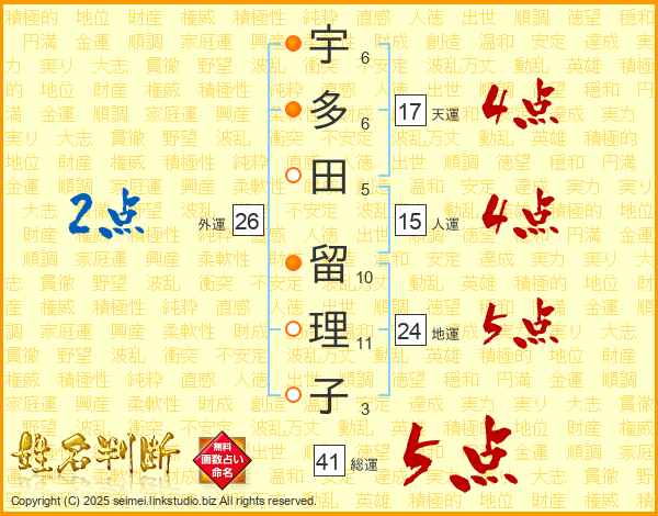 宇(6画)多(6画)田(5画) 留(10画)理(11画)子(3画)