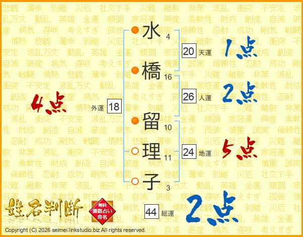 水(4画)橋(16画) 留(10画)理(11画)子(3画)