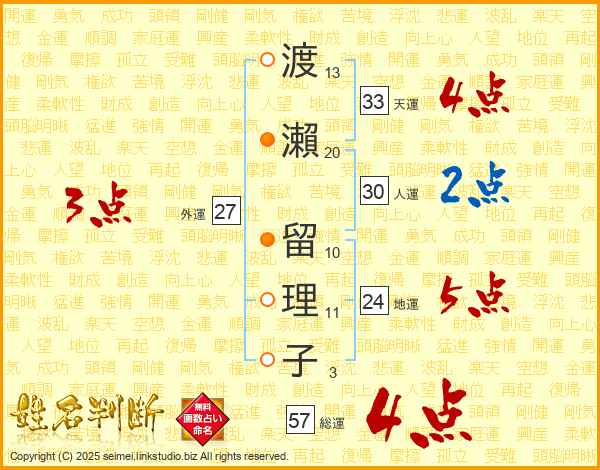 渡(13画)瀨(20画) 留(10画)理(11画)子(3画)