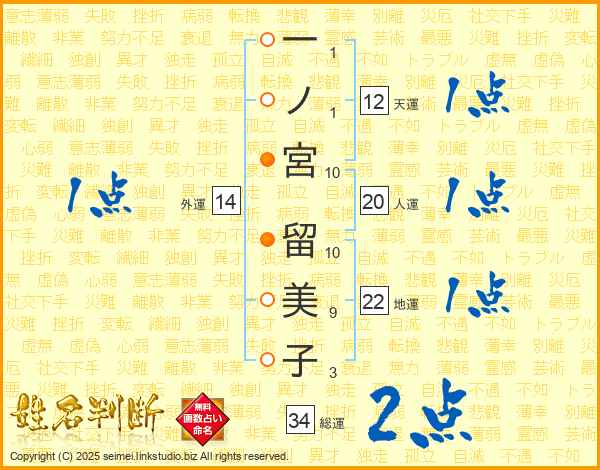 一(1画)ノ(1画)宮(10画) 留(10画)美(9画)子(3画)