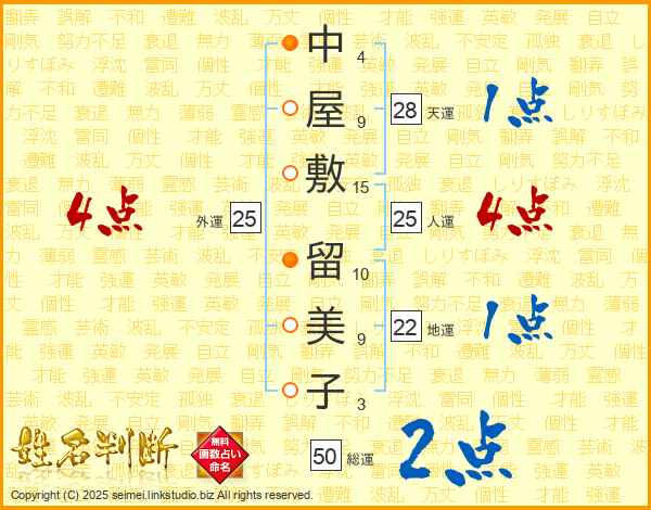 中(4画)屋(9画)敷(15画) 留(10画)美(9画)子(3画)