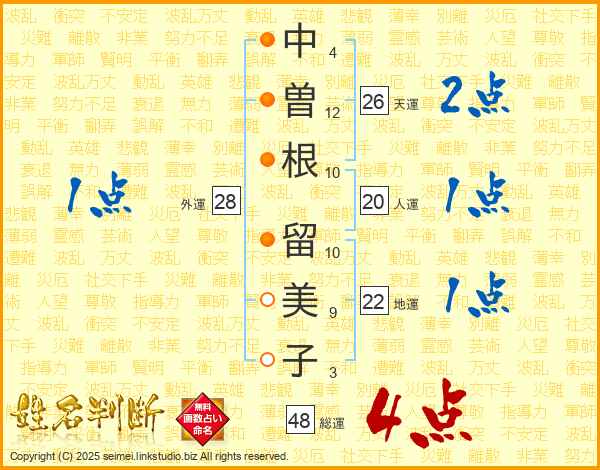 中(4画)曽(12画)根(10画) 留(10画)美(9画)子(3画)