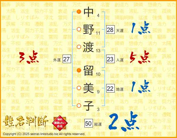中(4画)野(11画)渡(13画) 留(10画)美(9画)子(3画)