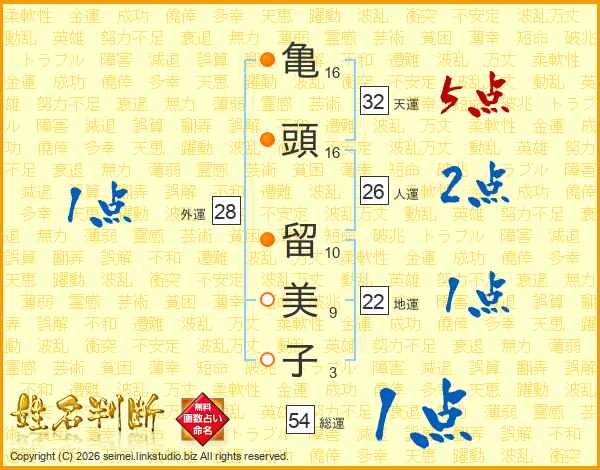 亀頭留美子さんの総運は54画の1点!