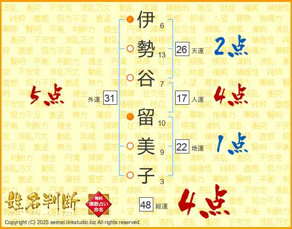 伊(6画)勢(13画)谷(7画) 留(10画)美(9画)子(3画)