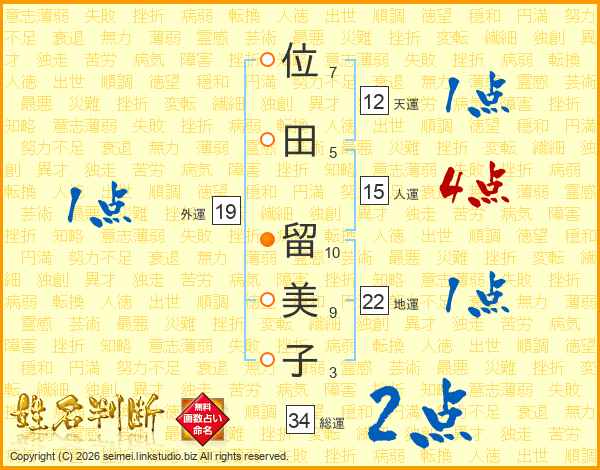 位(7画)田(5画) 留(10画)美(9画)子(3画)