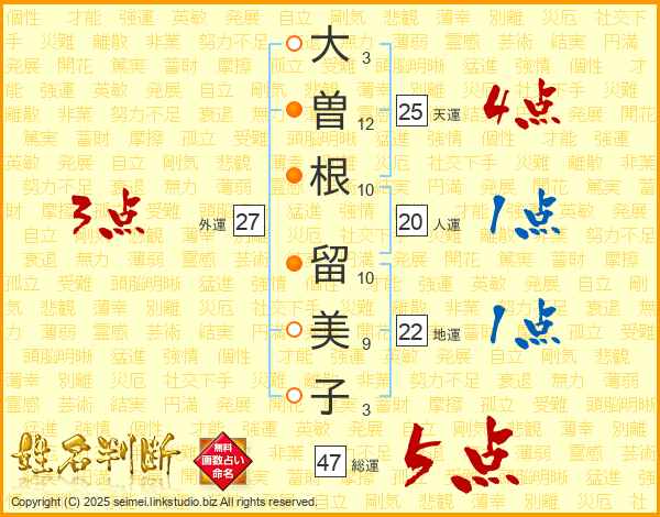 大(3画)曽(12画)根(10画) 留(10画)美(9画)子(3画)