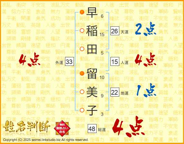 早(6画)稲(15画)田(5画) 留(10画)美(9画)子(3画)