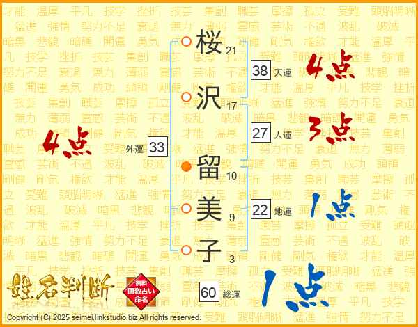 桜(21画)沢(17画) 留(10画)美(9画)子(3画)