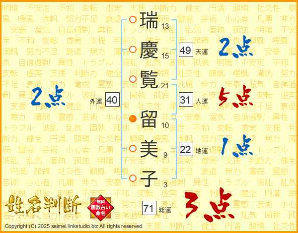 瑞(13画)慶(15画)覧(21画) 留(10画)美(9画)子(3画)