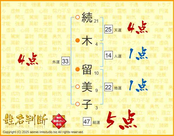 続木留美子さんの天運は25画の4点!