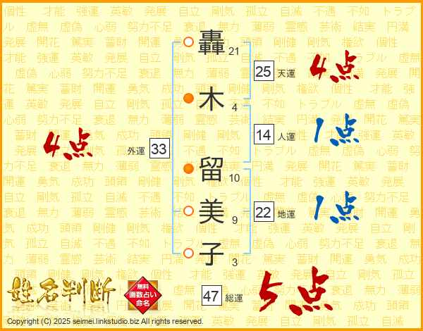 轟(21画)木(4画) 留(10画)美(9画)子(3画)
