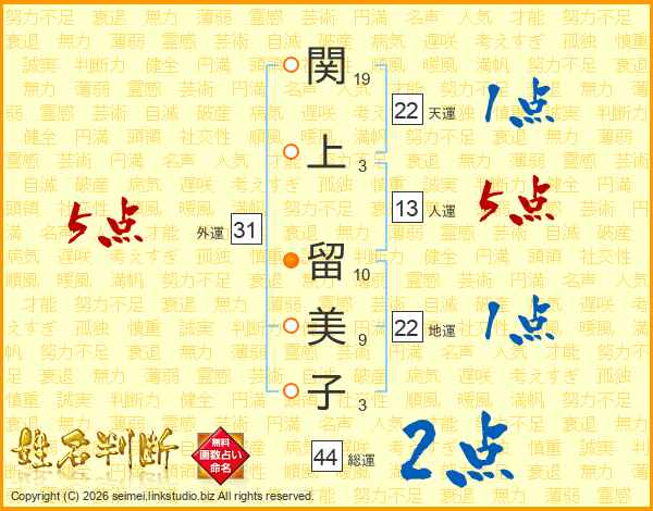 関(19画)上(3画) 留(10画)美(9画)子(3画)