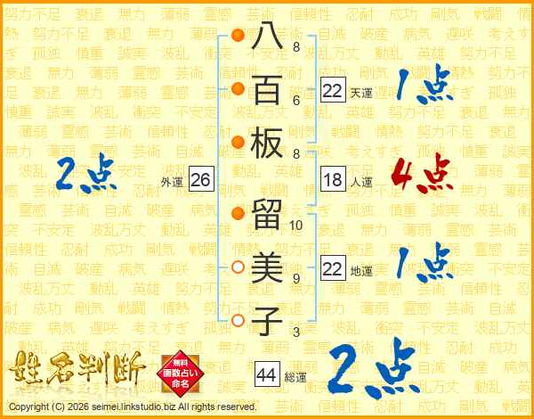 八(8画)百(6画)板(8画) 留(10画)美(9画)子(3画)