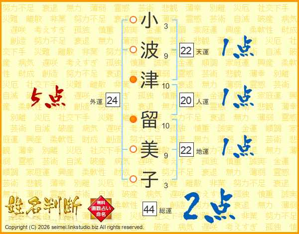 小(3画)波(9画)津(10画) 留(10画)美(9画)子(3画)