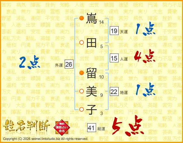 嶌(14画)田(5画) 留(10画)美(9画)子(3画)