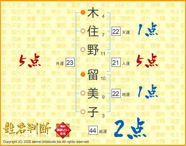 木(4画)住(7画)野(11画) 留(10画)美(9画)子(3画)