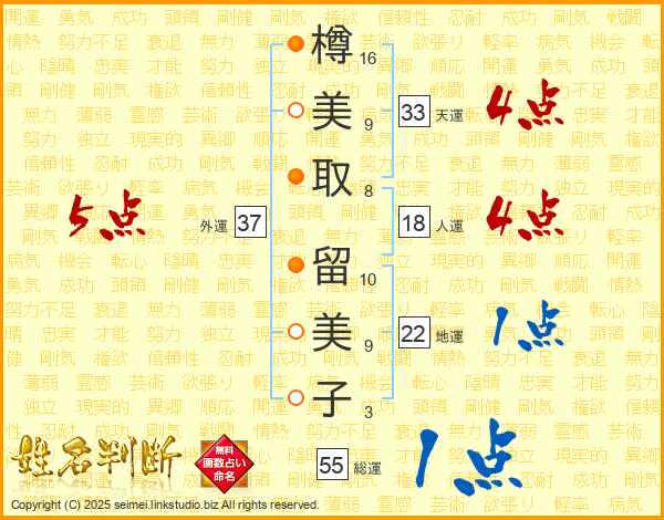 樽(16画)美(9画)取(8画)  留(10画)美(9画)子(3画)