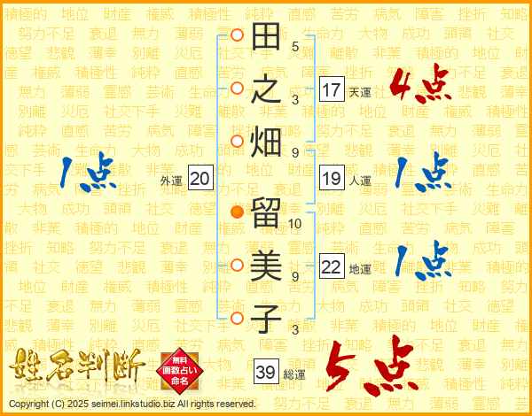 田之畑留美子さんの総運は39画の5点!
