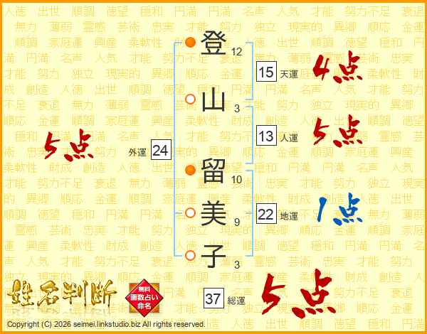 登(12画)山(3画) 留(10画)美(9画)子(3画)