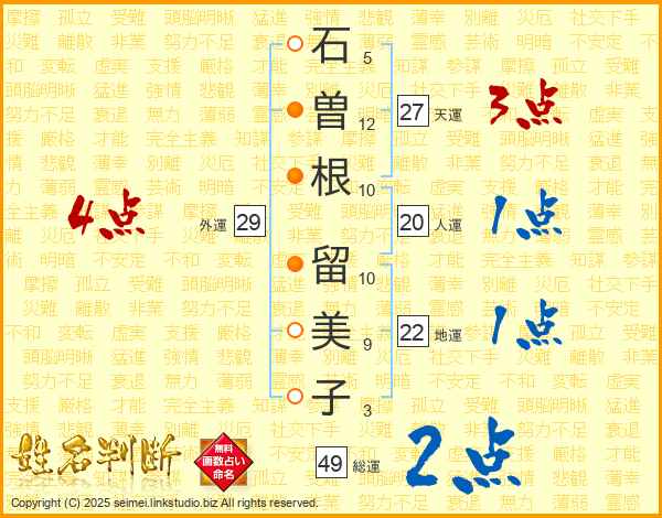 石(5画)曽(12画)根(10画) 留(10画)美(9画)子(3画)