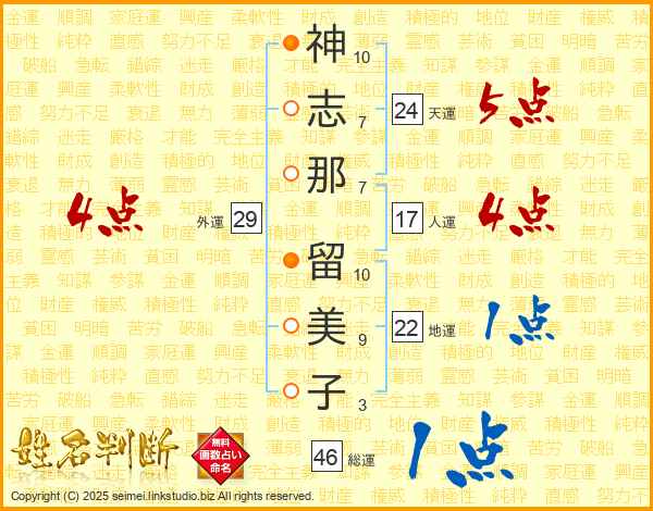 神(10画)志(7画)那(7画) 留(10画)美(9画)子(3画)