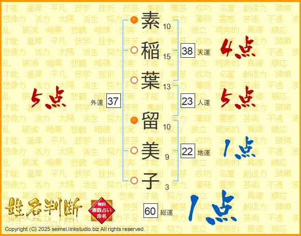 素(10画)稲(15画)葉(13画) 留(10画)美(9画)子(3画)
