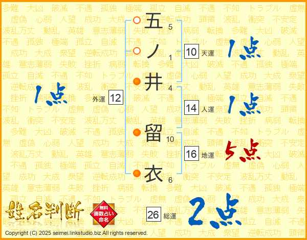 生活面を象徴する運勢です。外部から受ける影響力を表し、結婚運、家庭運や職場、環境への順応性を表します。総運から人運を引いた画数。姓や名が1文字の場合を除く。