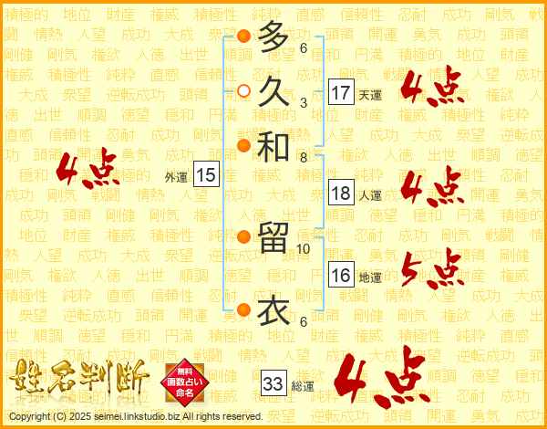 生活面を象徴する運勢です。外部から受ける影響力を表し、結婚運、家庭運や職場、環境への順応性を表します。総運から人運を引いた画数。姓や名が1文字の場合を除く。