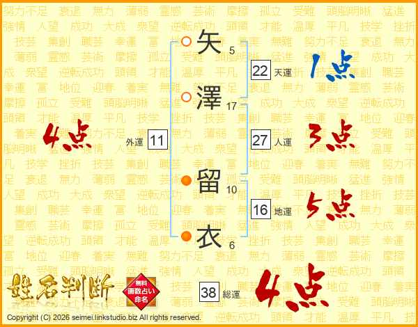 矢澤留衣さんの総運は38画の4点!