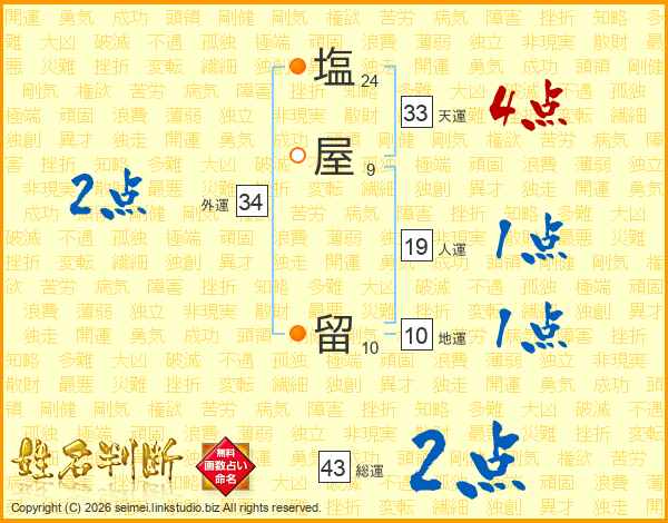 塩屋留さんの天運は33画の4点!