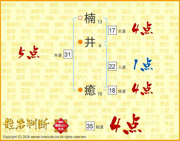楠(13画)井(4画) 癒(18画)