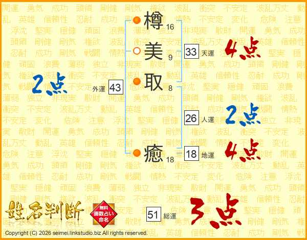 生活面を象徴する運勢です。外部から受ける影響力を表し、結婚運、家庭運や職場、環境への順応性を表します。総運から人運を引いた画数。姓や名が1文字の場合を除く。