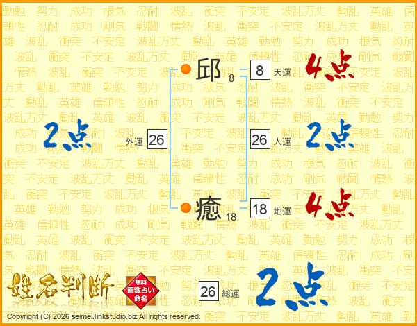生活面を象徴する運勢です。外部から受ける影響力を表し、結婚運、家庭運や職場、環境への順応性を表します。総運から人運を引いた画数。姓や名が1文字の場合を除く。