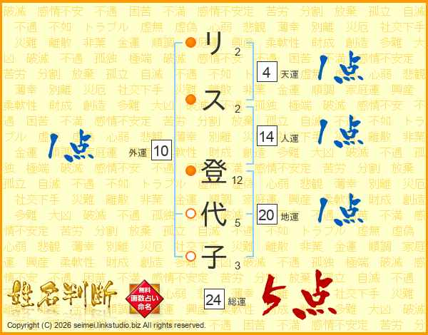 リ(2画)ス(2画) 登(12画)代(5画)子(3画)
