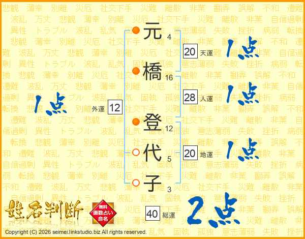 元(4画)橋(16画) 登(12画)代(5画)子(3画)