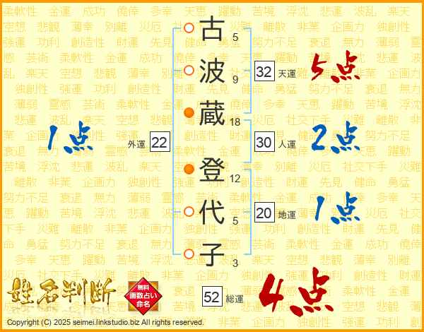 古(5画)波(9画)蔵(18画) 登(12画)代(5画)子(3画)
