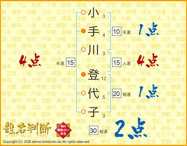 小(3画)手(4画)川(3画) 登(12画)代(5画)子(3画)