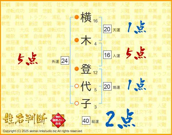 横(16画)木(4画) 登(12画)代(5画)子(3画)