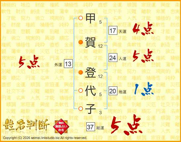 甲(5画)賀(12画) 登(12画)代(5画)子(3画)