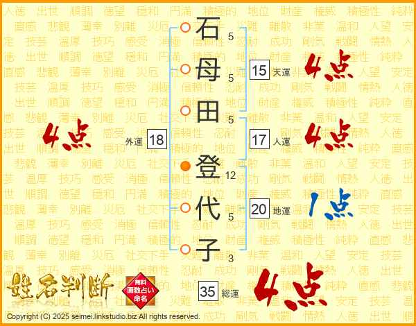 石(5画)母(5画)田(5画) 登(12画)代(5画)子(3画)