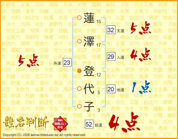 蓮(15画)澤(17画) 登(12画)代(5画)子(3画)