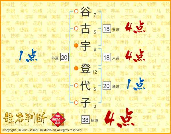 谷(7画)古(5画)宇(6画) 登(12画)代(5画)子(3画)