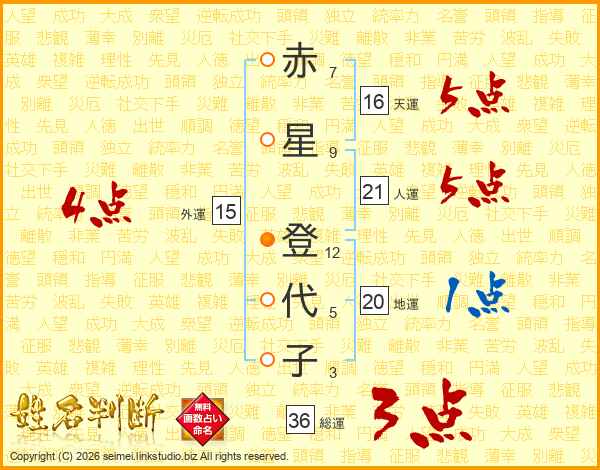 赤(7画)星(9画) 登(12画)代(5画)子(3画)